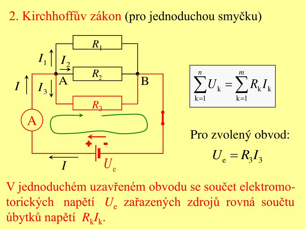 Kirchhoffův zákon (pro jednoduchou smyčku) r 1 r 3 a pro zvolenou smyčku:.. Kirchhoffových zákon ů, ur čit ě dají rovnice dohromady (ov ěřeno praxí). Zákon pro jednoduchou smyčku elektrické sítě. V tomto okamžiku se zásadn ě nebavím s nikým, kdo první rovnici nenapíše. Zákon pro uzel stejnosměrného obvodu, 2. Uzel je místo v obvodu, kde se stýkají nejméně tři vodiče. Jinými slovy, že proudy, které do uzlu vtečou se rovnají proudům, které z uzlu vytečou (proudy vytékající z uzlu mají opačná znaménka než vtékající). Tato analogie může některé problémy s představou elektrického proudu vyřešit. Elektrický proud v elektrické síti si lze představit jako vodu, která proudí potrubím. Kirchhoffovy zákony, nebo obvodové zákony, jsou dvě matematické rovnice, které se zabývají elektřinou, proudem a napětím (potenciální rozdíl) v modelu elektrických obvodů se soustředěnými prvky.. Zákon pro jednoduchou smyčku elektrické sítě.